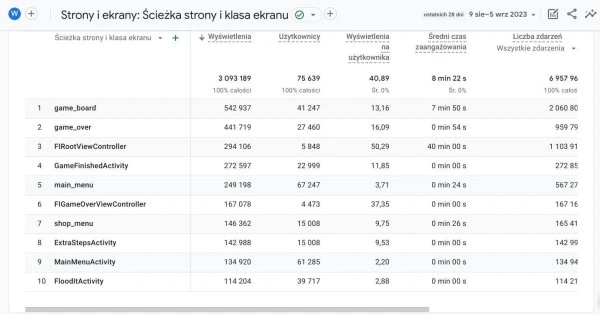 Za pomocą narzędzia możesz zweryfikować, które treści są najskuteczniejsze - w tym jaka jest ich długość czy typ. Wystarczy przejść do sekcji Zaangażowanie, a następnie Strony i ekrany. Dostępne dane możesz posortować według wybranych wskaźników, np. liczby generowanych zdarzeń, liczby użytkowników, średniego czasu zaangażowania odbiorców itp.