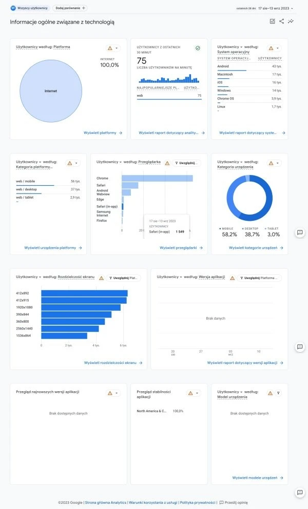W tej sekcji dostępne są informacje o technologiach wykorzystywanych przez odbiorców, czyli urządzeniach (mobilne, desktopy lub tablety), przeglądarkach, systemach operacyjnych oraz rozdzielczości ekranów.