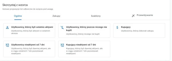 Po przejściu do niej po lewej stronie znajdziesz listę segmentów. Wystarczy, że klikniesz przycisk plusa, a w odpowiedzi otworzy się karta, w której możesz zdefiniować i tworzyć własne segmenty. W tym miejscu ponownie możesz wybrać dostępne, zdefiniowane przez narzędzie szablony segmentów lub stworzyć segment niestandardowy samodzielnie, zupełnie od zera.