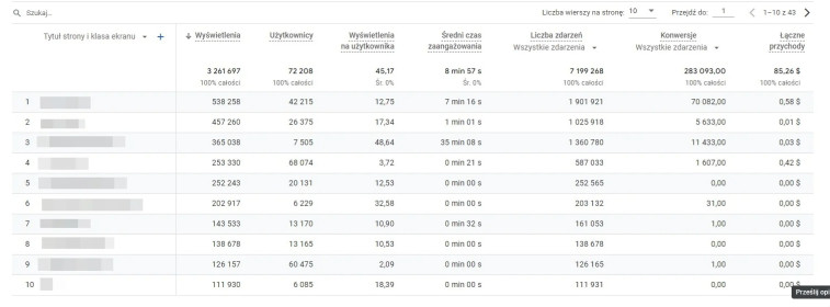 Raport w GA4 dotyczący stron odwiedzanych przez użytkowników.