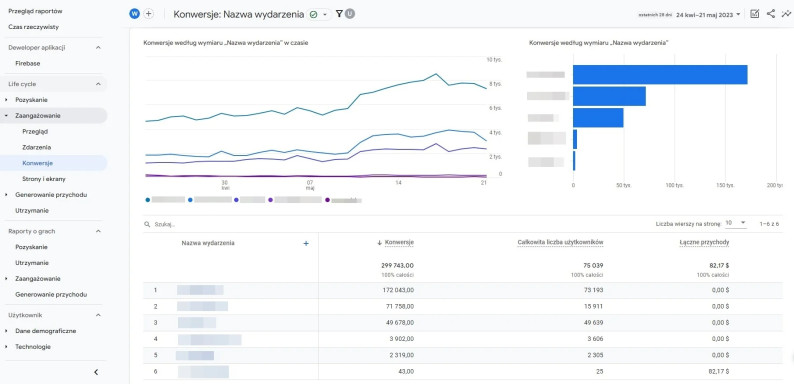 Raport Zdarzenia w Google Analytics 4 przekazuje dane dotyczące liczby osób, które spowodowały konkretne zdarzenia (inaczej konwersje) oraz dochodów, jakie generują. Zawiera on parametry takie jak: