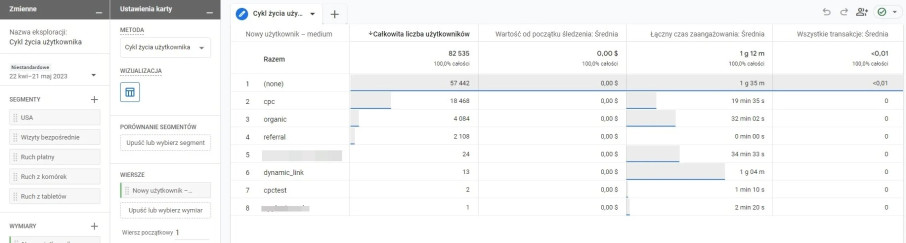 Czym jest cykl życia w GA4? To część raportu Eksploracje w Google Analytics 4 zawierająca informacje takie jak: