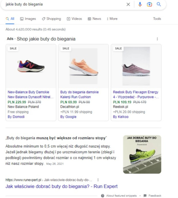 Wyszukiwarka Google to dla wielu użytkowników miejsce odpowiedzi na wiele pytań i szukania rozwiązania problemów. Jeśli użytkownik wpisze w Google frazę, która wiąże się częściowo z Twoimi produktami - możesz uświadomić mu, co będzie najlepszym rozwiązaniem problemu i skierować go do swojego sklepu. W tym przypadku bardzo efektywne będzie połączenie strategii Google Ads z pozycjonowaniem strony na frazy long-tail.