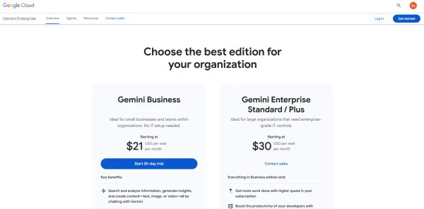 Podstawowa wersja jest bezpłatna. Plany biznesowe (Gemini Business, Gemini Enterprise) są płatne i dostępne w ramach Google Workspace na zasadzie subskrypcji. Ceny są uzależnione od liczby użytkowników oraz wybranego zakresu funkcjonalności.