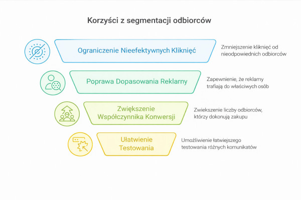 Segmentacja działa, ponieważ reklamy trafiają do osób, które są bardziej skłonne do zakupu lub wykonania innej konwersji. Zamiast płacić za wyświetlenia i kliknięcia użytkowników przypadkowych, budżet jest kierowany tam, gdzie istnieje realna potrzeba lub intencja.