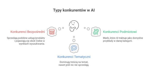 Konkurencja w AI search to nie tylko firmy, które sprzedają to samo co Ty. O uwagę użytkownika walczą też portale edukacyjne, blogi branżowe, marketplace’y czy serwisy z opiniami, które dla modeli AI są wygodnym źródłem wiedzy. Warto rozróżnić trzy typy konkurentów.