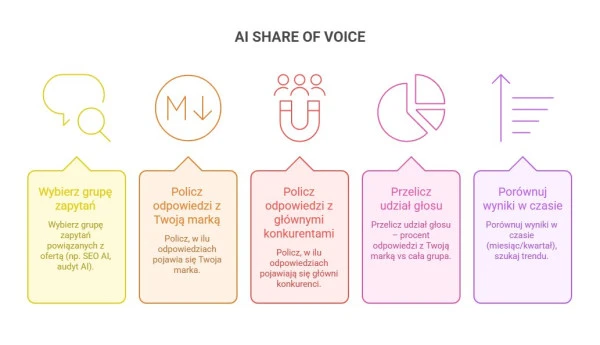 AI share of voice możesz analizować ogólnie (cały marketing internetowy) lub tematycznie – osobno dla SEO AI, audytów AI, pozycjonowania strony czy kampanii Google Ads. Jeżeli inwestujesz w treści edukacyjne w danym obszarze, po pewnym czasie powinieneś zobaczyć wzrost udziału głosu w odpowiedziach. Jeśli udział Twojej marki stoi w miejscu, a konkurenci rosną, to sygnał, że trzeba wzmocnić również autorytet (linki, wzmianki, publikacje zewnętrzne).