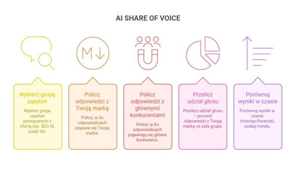 AI share of voice możesz analizować ogólnie (cały marketing internetowy) lub tematycznie – osobno dla SEO AI, audytów AI, pozycjonowania strony czy kampanii Google Ads. Jeżeli inwestujesz w treści edukacyjne w danym obszarze, po pewnym czasie powinieneś zobaczyć wzrost udziału głosu w odpowiedziach. Jeśli udział Twojej marki stoi w miejscu, a konkurenci rosną, to sygnał, że trzeba wzmocnić również autorytet (linki, wzmianki, publikacje zewnętrzne).