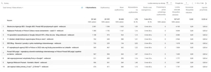 Informacje te pozwolą Ci sprawdzić, które strony generują najwięcej wyświetleń i największy ruch, a także które budzą największe zaangażowanie użytkowników. Jak badać zachowania użytkowników na stronie i jak interpretować dane? Jeśli czas przebywania na danej stronie jest długi, oznacza to, że treść jest angażująca. Jeśli przeciwnie, artykuły blogowe są wyświetlane jedynie przez kilkanaście bądź kilkadziesiąt sekund, być może trzeba popracować nad dopasowaniem treści do intencji wyszukiwania.