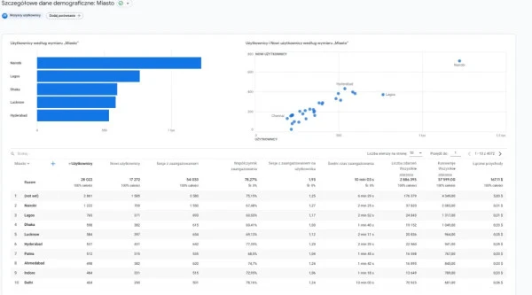 Lokalizacja użytkowników według miasta w GA4.