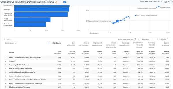 W raporcie Użytkownik w GA4 znajdziesz także informacje o zainteresowaniach Twoich odbiorców. Jak przeprowadzić analizę użytkowników i uwzględnić je w swojej strategii marketingowej? Zainteresowania użytkowników mogą mieć wpływ na wybrane przez Ciebie kanały marketingowe, sposób optymalizacji i budowy strony. Jeśli użytkownicy interesują się nowymi technologiami, musisz zapewnić im nowoczesny UX oraz takie same rozwiązania w swojej witrynie czy aplikacji. Dane na ten temat również znajdziesz w raporcie użytkownika w sekcji dane demograficzne GA4.