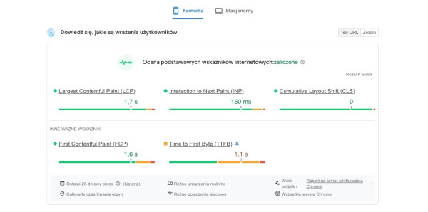 Wyniki pomiaru szybkości ładowania strony w narzędziu PageSpeed Insights.