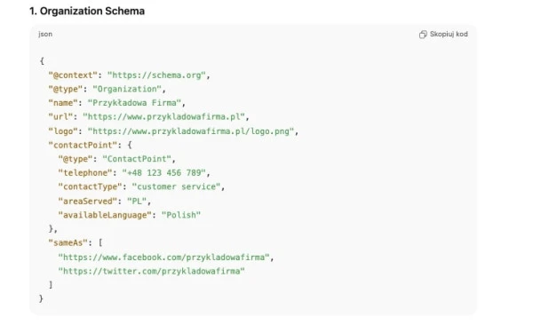 - Organization Schema - to najważniejszy element, który mówi AI, kim jesteś. Dzięki niemu masz szansę na to, by Twoja marka była traktowana poważnie i profesjonalnie. Wskazanie nazwy firmy, logo, kontaktów, wszystko to pomaga AI przypisać konkretne dane do Twojej organizacji.
