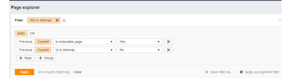 W mapie witryny roboty Google znajdą informację o stronach, które są istotne w Twojej witrynie. Chcesz sprawdzić, czy dany adres URL jest dostępny w mapie? W tym celu użyj Google Search Console. Jeśli adres URL nie jest zaindeksowany, a we fragmencie mapy znajdziesz informację „nie dotyczy”, powinieneś dodać adres URL do mapy, by ułatwić robotom indeksowanie. Chcesz wiedzieć, które adresy URL powinny znaleźć się w mapie? Skorzystaj z raportu Page Explorer dostępnego w Site Audit w Ahrefs. Filtrowanie wyników powinno wyglądać następująco: