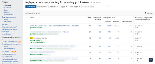 Lista najlepszych podstron pod względem profilu linkowego w narzędziu Ahrefs