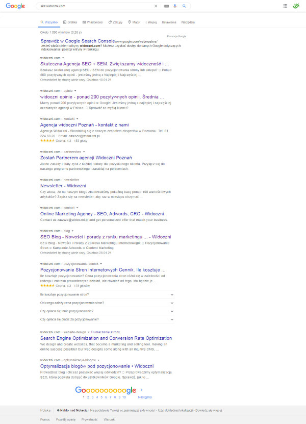 Po wpisaniu w wyszukiwarkę Google hasła: site:widoczni.com otrzymujemy listę podstron zaindeksowanych przez Google. W ten sam sposób możesz zweryfikować stan zaindeksowania Twojej witryny