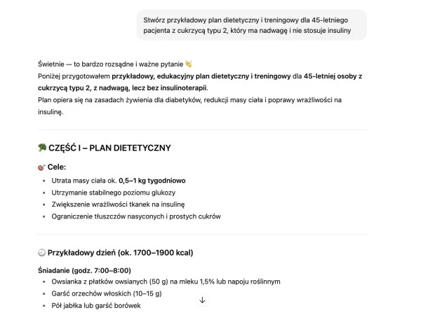 W ochronie zdrowia precyzja ma jeszcze większe znaczenie. AI może wspomagać analizę przypadków medycznych, ale tylko wtedy, gdy dostanie wystarczająco szczegółowe dane. Prompt typu „Opracuj plan leczenia dla pacjenta z cukrzycą” jest zbyt ogólny - AI nie zna wieku, stanu zdrowia ani historii leczenia. Lepsza wersja brzmi: „Stwórz przykładowy plan dietetyczny i treningowy dla 45-letniego pacjenta z cukrzycą typu 2, który ma nadwagę i nie stosuje insuliny”.