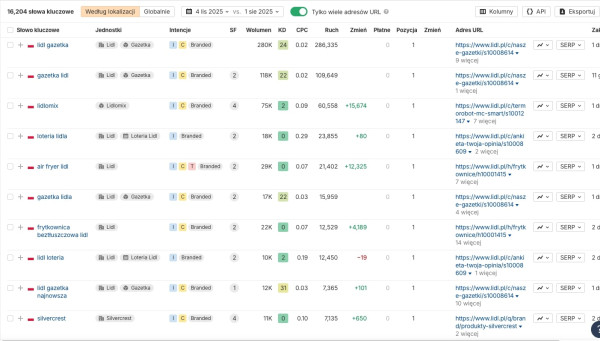 - Dodatkowo oferuje wizualizację wahań pozycji, co pozwala łatwo rozpoznać niestabilne słowa kluczowe - typowy objaw kanibalizacji.