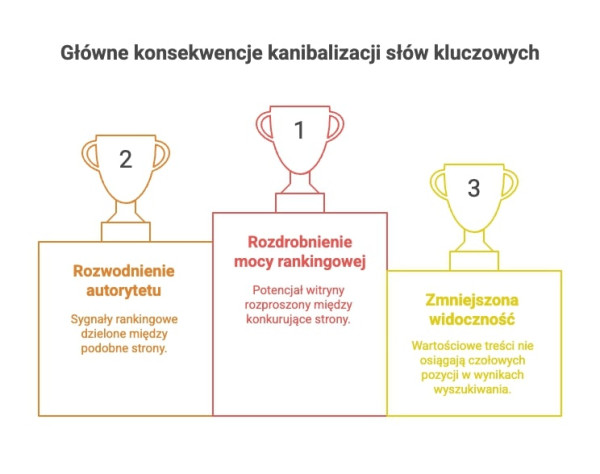 Kanibalizacja słów kluczowych prowadzi do zjawiska rozdrobnienia mocy rankingowej - czyli sytuacji, w której potencjał witryny nie jest spójny, lecz rozproszony pomiędzy kilka podstron o podobnej tematyce. Google traktuje je jako konkurujące ze sobą wyniki, przez co żadna z nich nie osiąga pełnej widoczności. Nawet wartościowe treści mogą nie przebić się do czołówki wyników wyszukiwania.