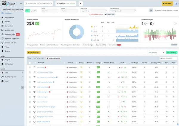 TrueRanker wyróżnia się też prostym interfejsem i możliwością integracji z Google Search Console, dzięki czemu dane są bardziej wiarygodne i aktualne.