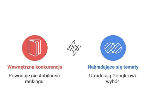 To rozproszenie obejmuje nie tylko ranking, ale też tzw. authority dilution, czyli rozwodnienie autorytetu domeny. W praktyce oznacza to, że sygnały rankingowe - takie jak liczba i jakość linków zwrotnych, wskaźniki zaangażowania użytkowników czy ocena treści - są dzielone między kilka stron o zbliżonej tematyce.