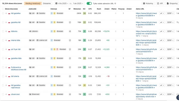 - Raport pokazuje, jak często zmienia się strona, która rankuje na dane zapytanie - jeśli pozycje się wahają między kilkoma URL-ami, to jasny sygnał kanibalizacji.