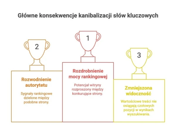 Kanibalizacja słów kluczowych prowadzi do zjawiska rozdrobnienia mocy rankingowej - czyli sytuacji, w której potencjał witryny nie jest spójny, lecz rozproszony pomiędzy kilka podstron o podobnej tematyce. Google traktuje je jako konkurujące ze sobą wyniki, przez co żadna z nich nie osiąga pełnej widoczności. Nawet wartościowe treści mogą nie przebić się do czołówki wyników wyszukiwania.