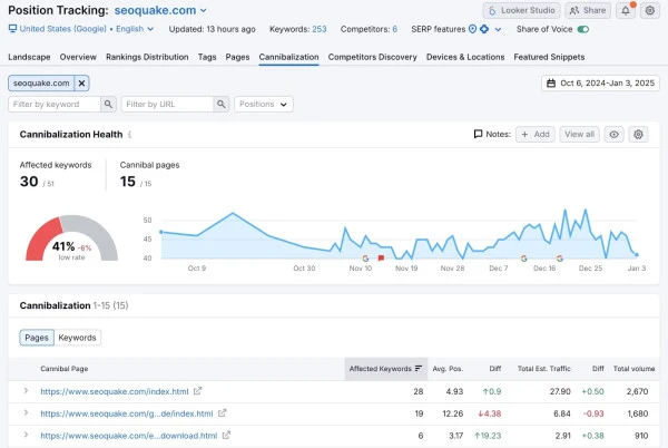 W Semrush dostępny jest specjalny Raport Kanibalizacji (Cannibalization Report) w sekcji Position Tracking. To narzędzie monitoruje, czy różne adresy URL w obrębie jednej domeny pojawiają się w wynikach wyszukiwania dla tego samego słowa kluczowego.