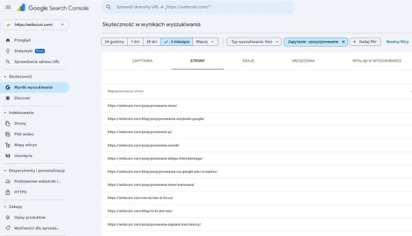 To najpewniejsze źródło danych dotyczących widoczności Twoich stron. W Google Search Console przejdź do raportu „Skuteczność”, a następnie do zakładki „Wyniki wyszukiwania”.