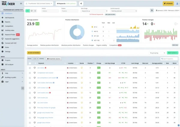TrueRanker wyróżnia się też prostym interfejsem i możliwością integracji z Google Search Console, dzięki czemu dane są bardziej wiarygodne i aktualne.