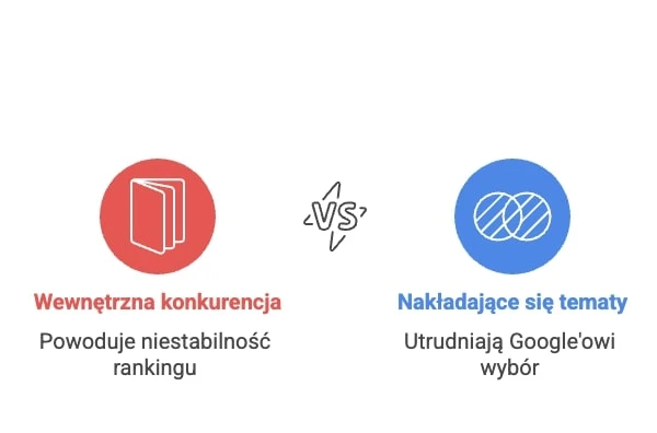 To rozproszenie obejmuje nie tylko ranking, ale też tzw. authority dilution, czyli rozwodnienie autorytetu domeny. W praktyce oznacza to, że sygnały rankingowe - takie jak liczba i jakość linków zwrotnych, wskaźniki zaangażowania użytkowników czy ocena treści - są dzielone między kilka stron o zbliżonej tematyce.