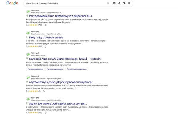 Dzięki temu Google pokaże wszystkie wyniki, nawet jeśli zwykle je grupuje lub ukrywa. To pozwala zobaczyć, jak wyszukiwarka naprawdę widzi Twoje strony, bez autokorekty i personalizacji.