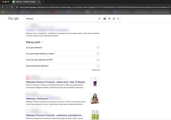 - Przejrzyj wyniki wyszukiwania - sprawdź pozycję słów kluczowych. Warto przejrzeć pierwszą stronę wyników, aby zobaczyć, które strony lub treści zajmują wysokie pozycje.