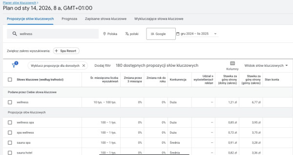 - Szacowanej liczbę kliknięć i wyświetleń reklamy na dane słowo kluczowe,