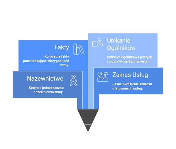 Treść strony „O nas” musi być konsekwentna - zarówno pod względem języka, jak i kontekstów. Mieszanie różnych grup docelowych w jednym opisie utrudnia algorytmom jednoznaczną klasyfikację encji. Im precyzyjniej określisz odbiorcę, tym łatwiej AI przypisze firmę do właściwej kategorii.