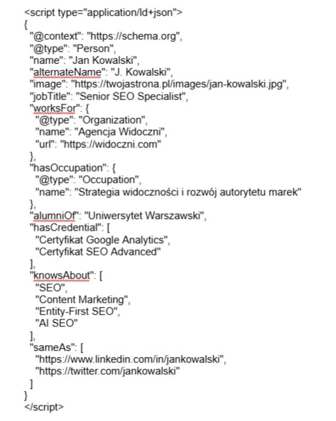 Najlepszym rozwiązaniem będzie stworzenie osobnych obiektów Person dla każdej ważnej osoby w zespole (np. ekspertów, liderów, autorów treści). Bardzo istotna jest spójność encji: jeśli firma posiada już wdrożony typ Organization, obiekt Person powinien się do niego jawnie odwoływać, dzięki czemu AI będzie mogło lepiej zrozumieć wzajemne relacje.