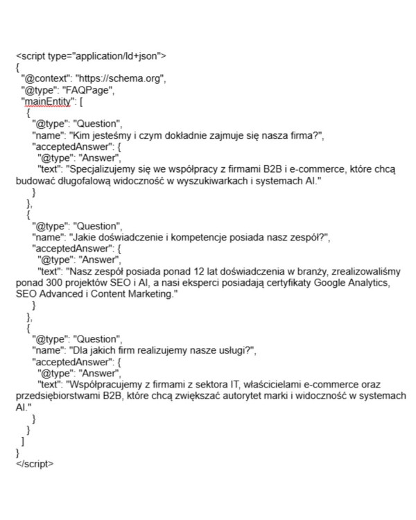 Typ FAQPage możesz wdrożyć w taki sam sposób jak opisany już typ Person. Pozwala on algorytmom jednoznacznie zidentyfikować pary pytanie-odpowiedź i wykorzystać je w generowanych wynikach, bez konieczności interpretowania całego tekstu strony. To może zwiększyć szanse na cytowanie marki w odpowiedziach i rekomendacjach, o ile strona spełnia także ogólne wymagania jakości i poprawnego wdrożenia danych strukturalnych (https://developers.google.com/search/docs/appearance/structured-data/faqpage).