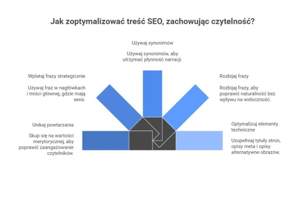 - Świadomy dobór i rozmieszczenie fraz – frazy powinny wspierać zrozumienie tematu przez algorytmy wyszukiwarek i naturalnie wpisywać się w treść, zamiast ją dominować.