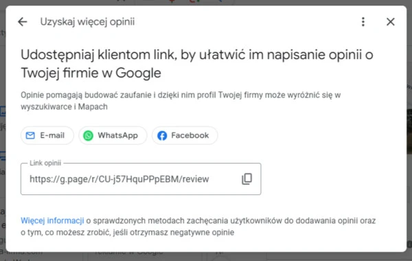 Opinie wpływają na decyzje użytkowników i na ocenę firmy przez Google. Zachęcaj klientów do dzielenia się doświadczeniami po zakończonej usłudze lub zakupie. Odpowiadaj na każdą opinię, zarówno pozytywną, jak i krytyczną. Sposób komunikacji pokazuje, że dbasz o relacje i reagujesz na potrzeby klientów.