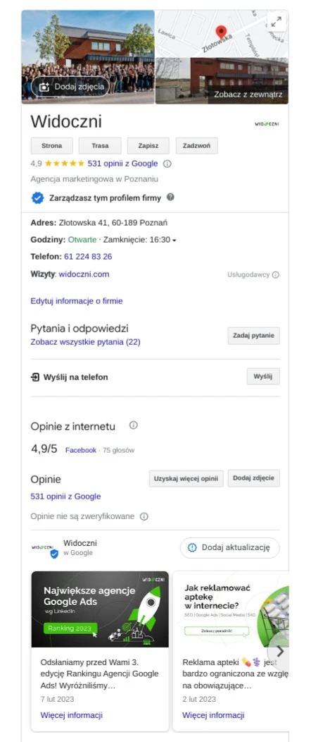 Wizytówka wyświetlona w Panelu wiedzy w Google