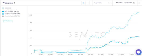Jak sprawdzić efekty SEO? Może w tym pomóc weryfikacja widoczności SERP. Jak to zrobić? W tym celu wykorzystaj Senuto, które pozwala zweryfikować liczbę fraz, na które witryna jest widoczna w top3, top10 i top50 organicznych wyników wyszukiwania. Jeśli liczba fraz w top3, top i top50 rośnie, pozycjonowanie strony jest skuteczne.