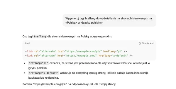 Przykład tagów hreflang wygenerowanych przez ChatGPT.
