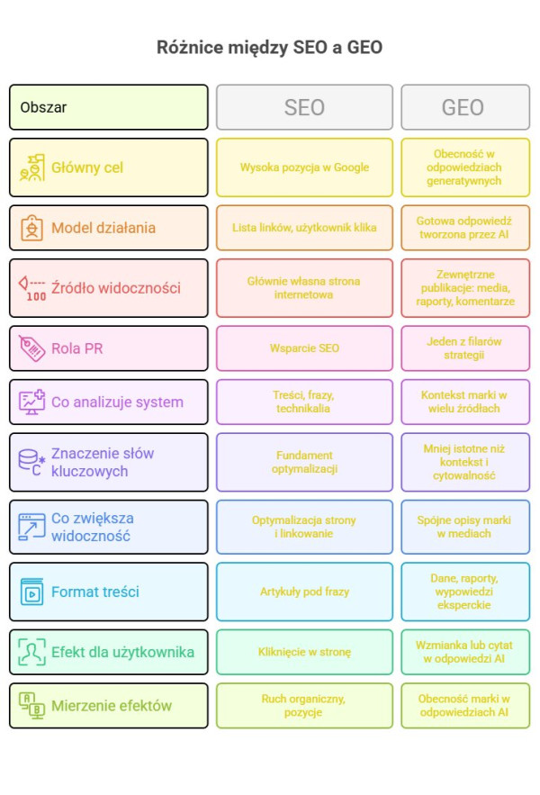 • Czym GEO różni się od SEO i dlaczego jest naturalnym środowiskiem PR?