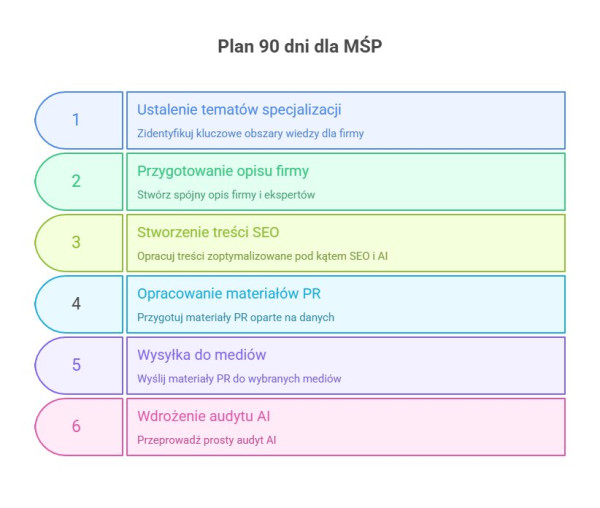 W ten sposób nie budujesz wszystkiego od zera, a wykorzystujesz to, co już masz w SEO i contencie, dokładasz PR i zaczynasz krok po kroku pracować nad widocznością w AI w sposób możliwy dla MŚP.