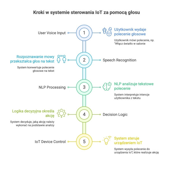 Jak działa system, który umożliwia sterowanie urządzeniami IoT za pomocą poleceń głosowych w AI Search? Proces ten obejmuje kilka kluczowych etapów: