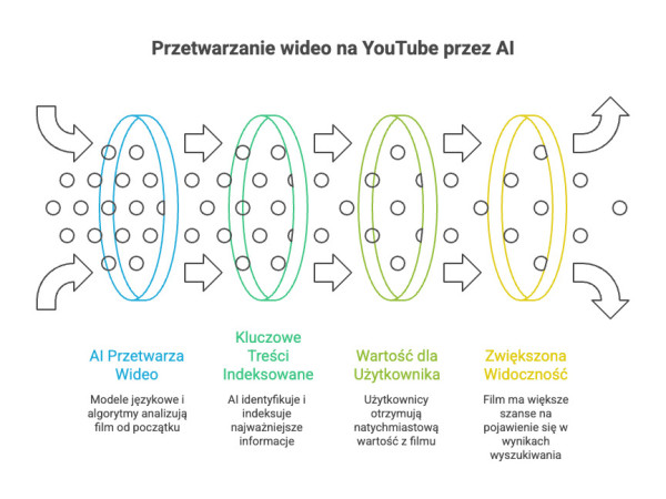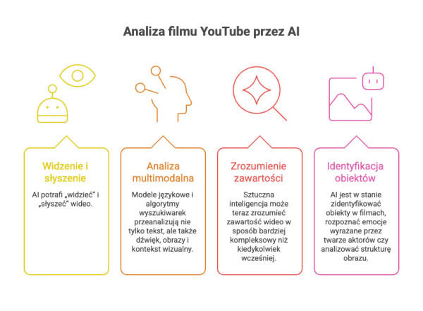 Dlaczego YouTube ma taką przewagę? Przede wszystkim dlatego, że AI potrafi „widzieć” i „słyszeć” wideo. Modele językowe (LLM) i algorytmy wyszukiwarek przeanalizują nie tylko tekst w opisie filmu, ale także dźwięk, obrazy i kontekst wizualny. Dzięki rozwoju technologii multimodalnych, sztuczna inteligencja może teraz zrozumieć zawartość wideo w sposób bardziej kompleksowy niż kiedykolwiek wcześniej. Na przykład: AI jest w stanie zidentyfikować obiekty w filmach, rozpoznać emocje wyrażane przez twarze aktorów czy analizować strukturę obrazu, by lepiej dopasować go do zapytań użytkowników.