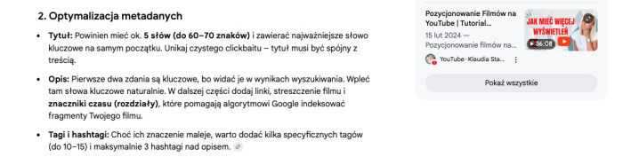 Struktura filmu, w której najważniejsza informacja pada na początku, jest niezwykle istotna w kontekście SEO AI. Dzięki temu, że modele językowe i algorytmy wyszukiwarek zaczynają przetwarzać wideo od samego początku, musisz dostarczyć najważniejsze odpowiedzi lub informacje już w pierwszych kilku sekundach. Taki format ułatwia AI szybkie wyciąganie wniosków i indeksowanie kluczowych treści, co sprawia, że film jest łatwiejszy do wykorzystania w odpowiedziach generowanych przez algorytmy, takich jak Google AI Overviews. Dlatego ważne jest, aby wiedzieć, jaka jest rola YouTube w SEO AI. Użytkownicy od razu otrzymują wartość, a Twój film staje się bardziej atrakcyjny w oczach sztucznej inteligencji, zwiększając jego szansę na pojawienie się we fragmentach do cytowania w wynikach wyszukiwania.