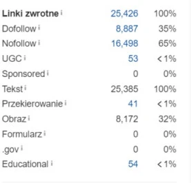 Informacja z narzędzia Ahrefs o liczbie linków dofollow i nofollow prowadzących do witryny