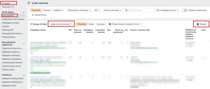 Aby uzyskać w Ahrefs informację na temat linków dofollow i nofollow, musisz przejść do raportu Page Explorer w zakładce “Przegląd”. Dane z raportu możesz wyeksportować do odrębnego pliku, wówczas wykonanie analizy będzie łatwiejsze.