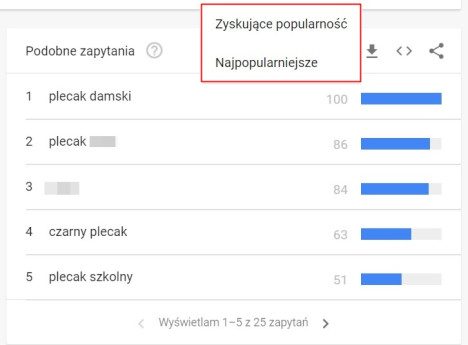 Widok najpopularniejszych zapytań i tematów w narzędziu Google Trends